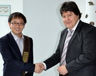 Am 22. März 2017 verteidigte Kai Zheng erfolgreich seine Doktorarbeit im Bereich bioaktiver Glas-Nanopartikel für biomedizinische Anwendung, welche unter der Aufsicht von Professor Aldo R. Boccaccini an unserem Institut erarbeitet wurde. Neben Prof. Boccaccini waren Prof. Antonio Salinas (Department of Inorganic and Bioinorganic Chemistry, Complutense University of Madrid, Spanien), Prof. Robin Klupp-Taylor (Department of Chemical and Biological Engineering, FAU), und Prof. Stephan Wolf (Insititute for Glass and Ceramics, FAU) Mitglieder des Verteidigungskommittees. Prof. Boccaccini lobte Kai’s zukunftsweisende Forschung mit Fokus auf der Synthese von Bioglas-Nanopartikeln (BGNP) mit zusätzlichen Funktionalitäten durch Anpassung der Stoeber Sol-Gel Methode. Dies hat zu einigen neuen Ionen-dotierten BGNP geführt, die für vielfältige Anwendungen, von Knochen Tissue Engineering über Bildgebung bis hin zu Drug Delivery-Systeme, von Interesse sind. Auch die Anhaftung von Biomolekülen an die BGNP Oberflächen wurde untersucht. Kai war Stipendiat des China Scholarship Council (CSC) und arbeitete mit Forschungsgruppen von anderen FAU Departments, der TU München und AGH Krakau während seiner Forschungsarbeit zusammen. Einige Veröffentlichungen sind aus Kai’s Ergebnissen entstanden (z.B. [1-3]). Wir gratulieren Kai zur sehr erfolgreichen Erlangung des Doktorgrades und wünschen ihm alles Gute für seine Zukunft. (Zum Vergrößern, Bilder anklicken)