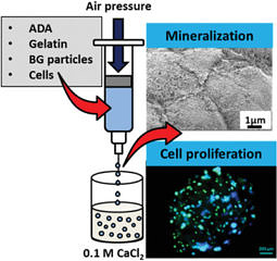 Unsere neue Arbeit über die Herstellung und Charakterisierung von zellbeladenen Alginat-Dialdehyd-Gelatinekapseln mit 45S5 bioaktiven Glas (BG) Mikropartikeln wurde in Macromolecular Bioscience [1] veröffentlicht. Die Studie wurde von Dr. Supachai (Boo) Reakasame geleitet. Es wurde eine erfolgreiche Verkapselung von MG-63-Zellen in BG-haltigen Kapseln erreicht. Dies bestätigt, dass die Zugabe von BG die Aktivität der verkapselten Zellen und eine lokale Mineralisierung reguliert.