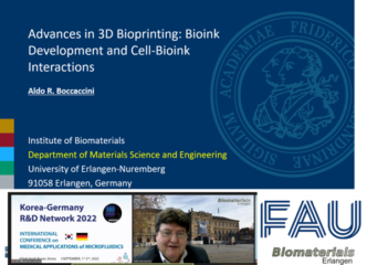Prof. Boccaccini war ein eingeladener Redner auf der Internationalen Konferenz über medizinische Anwendungen der Mikrofluidik des Korea-Deutschland Netzwerks für Forschung und Entwicklung, welche am 1. und 2. September 2022 in Busan, Korea, stattfand und im Hybridformat abgehalten wurde. Prof. Boccaccini hielt den Vortrag mit dem Titel: „Advances in 3D Bioprinting: Bioink Development and Cell-Bioink Interactions“. Diese Tagung wurde von der Deutschen Forschungsgemeinschaft (DFG) und der National Research Foundation of Korea (NRF) gefördert.
