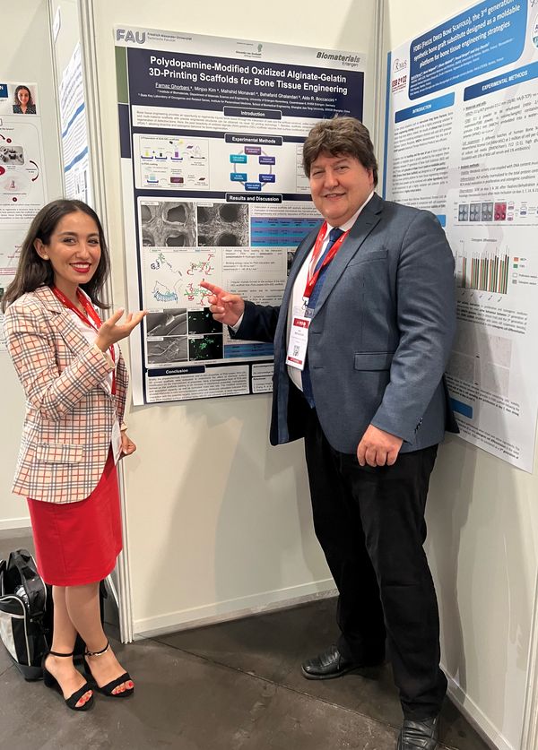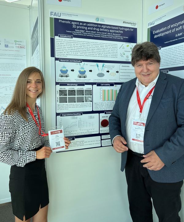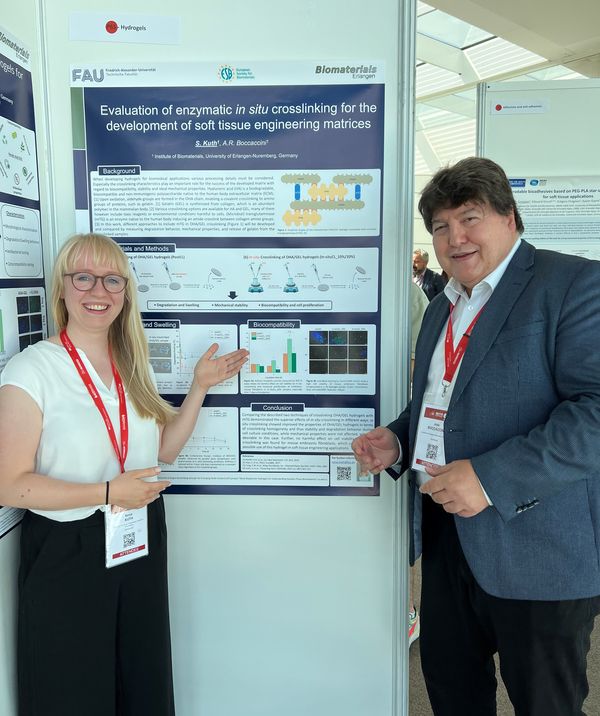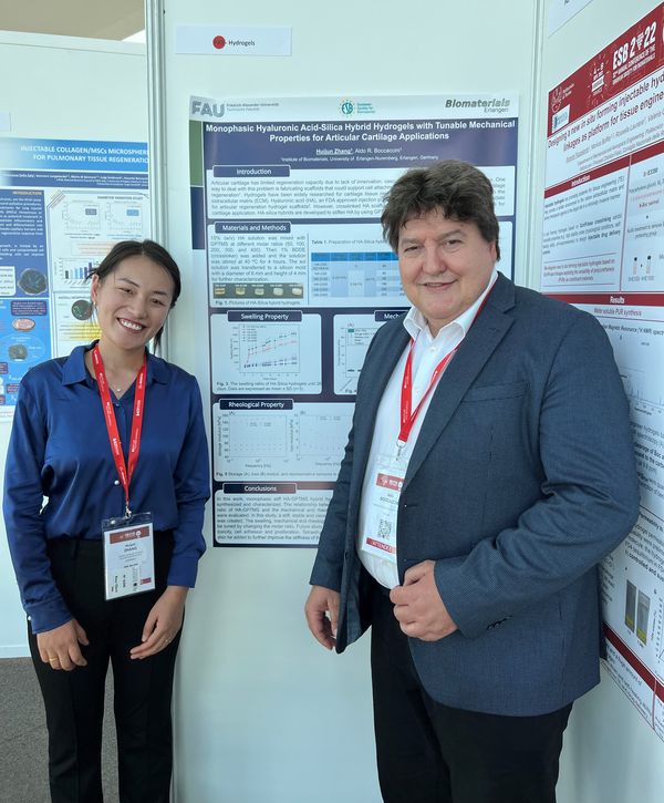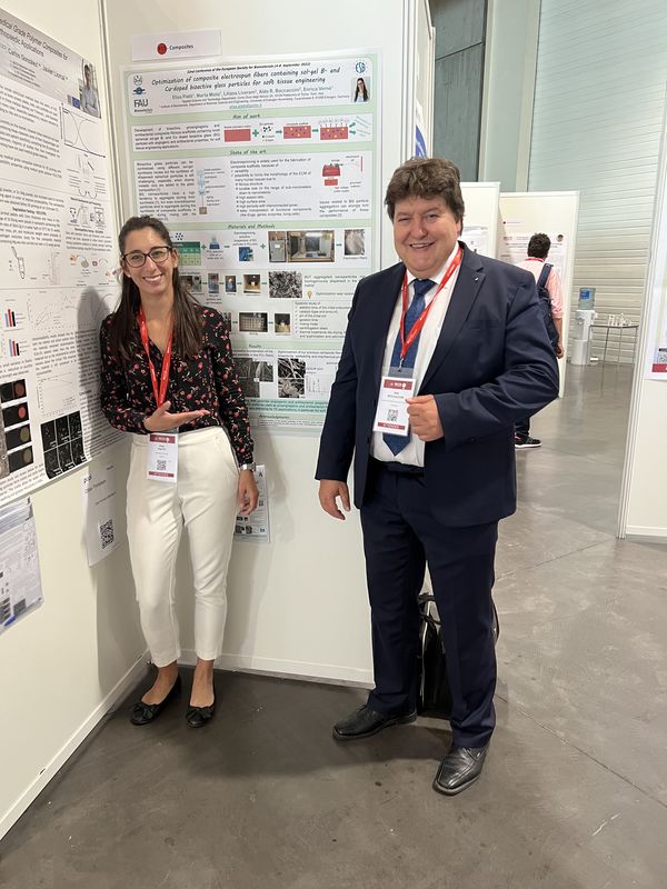 Unser Lehrstuhl war auf der 32. Jahreskonferenz der Europäischen Gesellschaft für Biomaterialien (ESB 2022), die vom 4. bis 8. September 2022 in Bordeaux, Frankreich, stattfand, stark vertreten. Faina Bider, Huijun Zhang, Sonja Kuth und Irem Unalan (Doktorandinnen) sowie Dr. Farnaz Ghorbani präsentierten die Ergebnisse ihrer Projekte (Posterpräsentationen). Prof. Boccaccini war Co-Vorsitzender von zwei Sitzungen: „Oberflächenfunktionalisierung“ und die klinische Sitzung I: „Kardiovaskuläre klinische Anwendungen“, die auf großes Interesse stießen. Darüber hinaus wurden mehrere andere Poster in Zusammenarbeit mit Forschenden anderer Einrichtungen präsentiert, z. B. mit Dr. Poh Soo Lee, TU Dresden, Frau Elisa Piatti (Polytechnikum Turin, Italien) und Dr. Oznur Demir-Oguz, Technische Universität Riga, Lettland. Darüber hinaus nahm Prof. Aldo R. Boccaccini am 7. September als Mitglied des ESB-Rates und derzeitiger Vizepräsident der ESB an der Generalversammlung der Europäischen Gesellschaft für Biomaterialien (ESB) teil.