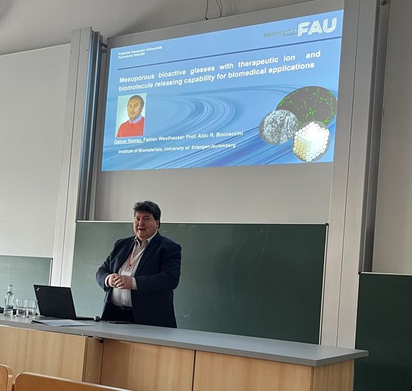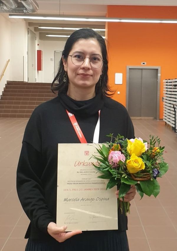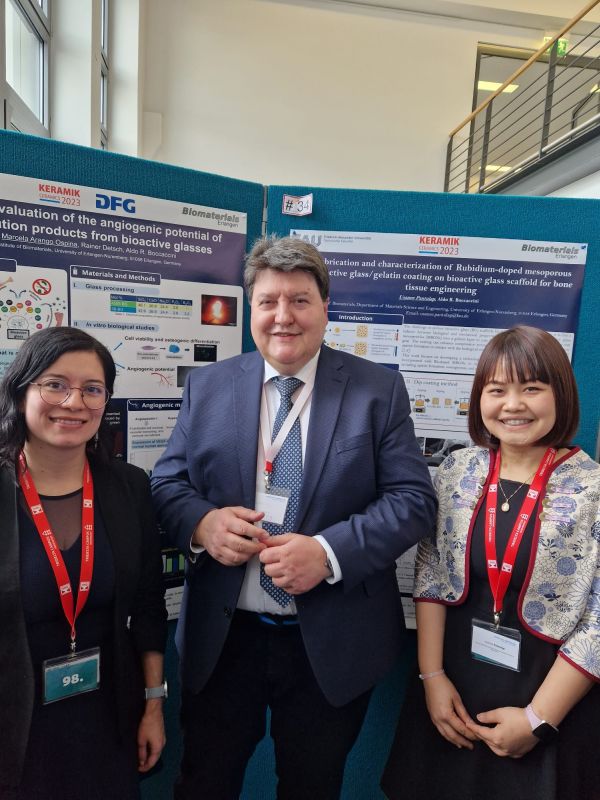 Unser Lehrstuhl wurde auf der 98. Jahrestagung der Deutschen Keramischen Gesellschaft (DKG) Keramik/Ceramics 2023 durch Frau Marcela Arango-Ospina (Doktorandin), Frau Usanee Pantulap (Doktorandin), Frau Akrity Anand (Doktorandin, am FunGlass Centre, Slowakei) und Prof. Aldo R. Boccaccini vertreten. Auch Dr. Rajan Choudhary (Postdoktorand am BBCE, Lettland, und derzeit Gastwissenschaftler an unserem Lehrstuhl) nahm an dem Treffen teil. Die Konferenz fand vom 27. bis 30. März 2023 in Jena statt. Prof. Boccaccini war Mitglied des Organisationskomitees der Keramik/Ceramics 2023 und leitete die Organisation der „Bioceramics“-Sessions, die er während der Veranstaltung mit leitete. Er präsentierte den Vortrag: „Mesoporous bioactive glasses with therapeutic ion and biomolecule releasing capability for biomedical applications“ und vertrat Dr. Qaisar Nawaz, der krankheitsbedingt nicht teilnehmen konnte. Frau Marcela Arango-Ospina präsentierte das Poster „In vitro Evaluation of the Angioogenic Potential of Dissolution Products from Bioactive Glasses“, für das sie einen der „Best Poster“-Awards erhielt. Gut gemacht!