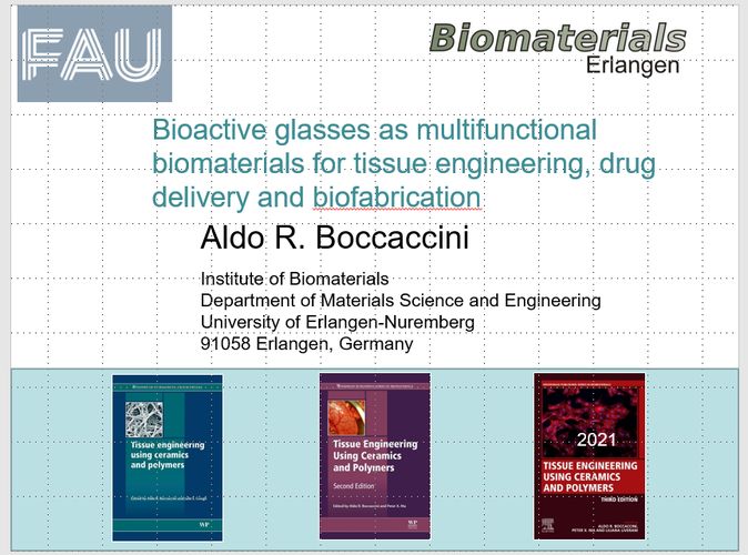Prof. Boccaccini war ein eingeladener Redner auf der E-MRS-Frühjahrstagung 2023, die vom 29. Mai bis 2. Juni in Straßburg, Frankreich, stattfand. Professor Boccaccini hielt den Vortrag: „Bioaktive Gläser als multifunktionale Biomaterialien für Tissue Engineering, Drug Delivery und Biofabrication“ im Symposium H „Fortgeschrittene Strategien für intelligente funktionelle und multifunktionale Biomaterialien und Bioschnittstellen“, auf Einladung der Symposiumsorganisatoren Profs. Graziana Messina, Paula Colavita und Ayşe G. Karakecili.