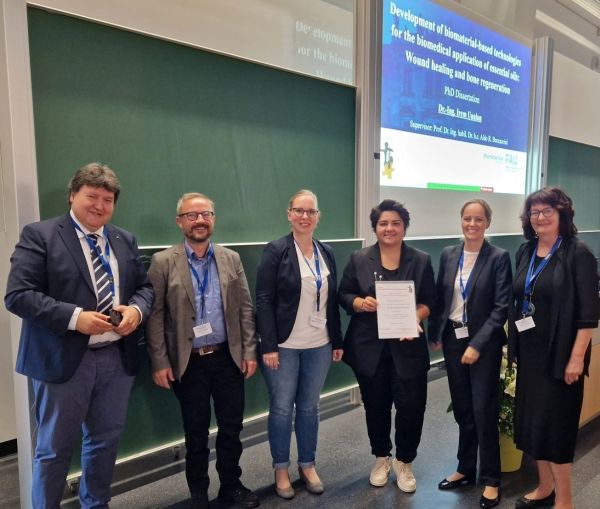 Dr. Irem Unalan, unsere Alumna (ehemalige Doktorandin) und derzeitige Post-Doktorandin an unserem Lehrstuhl, hat den Preis für die beste Doktorarbeit 2023 der Deutschen Gesellschaft für Biomaterialien (DGBM) gewonnen. Irem erlangte ihren Dr.-Ing. im Jahr 2022 mit einem Projekt, das sich auf die Verarbeitung und Charakterisierung von ätherischen Ölen in durch Elektrospinnen, 3D-Druck oder Schaumreplikate hergestellten Gerüsten für potenzielle Anwendungen in der Wundheilung und im Hartgewebe-Engineering konzentrierte und von Prof. Aldo R. Boccaccini betreut wurde. Ihr Projekt wurde mit einem DAAD-Stipendium durchgeführt. Die Urkunde wurde während der Jahrestagung der Deutschen Gesellschaft für Biomaterialien vom 14. bis 16. September 2023 in Jena verliehen. Herzlichen Glückwunsch!