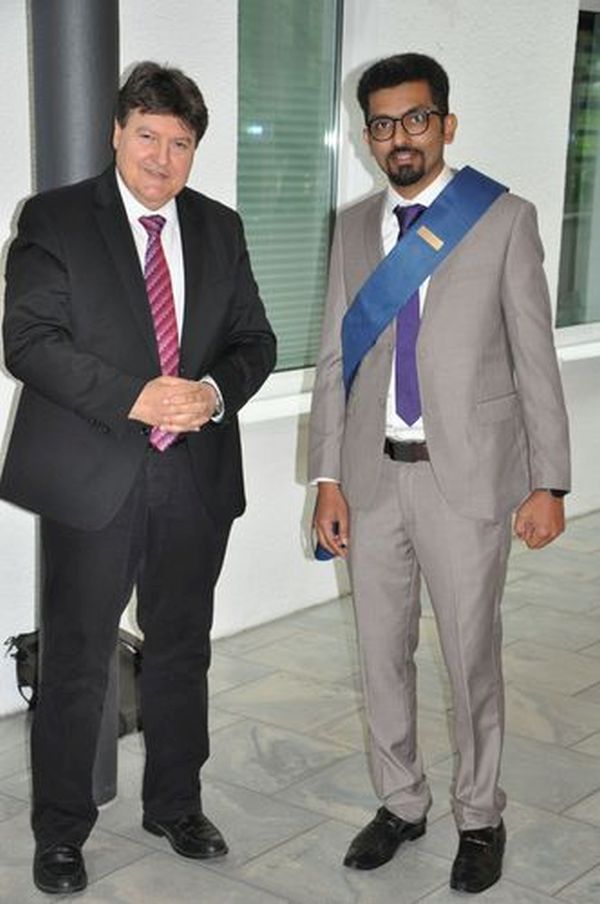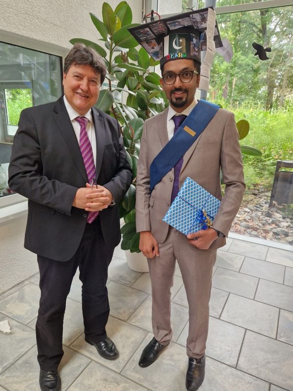 Wir gratulieren Muhammad Asim Akhtar zur erfolgreichen Verteidigung seiner Doktorarbeit mit dem Titel „Advances in EPD for coatings and self-standing structures based on biopolymers and bioactive glasses for biomedical applications“ am 14. Juni 2024. Asim hat sein Promotionsprojekt an unserem Lehrstuhl unter der Leitung von Prof. Aldo R. Boccaccini durchgeführt. Die Prüfungskommission für die Doktorarbeit bestand aus Prof. Boccaccini, Prof. Annabel Braem (Kath. Universität Leuven, Belgien), Prof. Andreas Burkovsky (Institut für Biologie der FAU) und Prof. Dominique de Ligny (Institut für Glas und Keramik, FAU). Nach der erfolgreichen Verteidigung von Asims Doktorarbeit hob Prof. Boccaccini die interessanten Ergebnisse und den innovativen Charakter seines Forschungsprojekts hervor, bei dem es um die Entwicklung von mit Ionen dotierten Beschichtungen und selbsttragenden Schichten auf Chitosanbasis durch elektrophoretische Abscheidung (EPD) geht, die bioaktive Glasnanopartikel und phytotherapeutische Wirkstoffe in verschiedenen Kombinationen enthalten. Dieses Projekt knüpfte an frühere Forschungsaktivitäten auf dem Gebiet der EPD in unserem Lehrstuhl an. In seinem Projekt etablierte Asim eine EPD-Plattform, um Beschichtungen mit potenziellen synergistischen Effekten zu erhalten, nämlich bioaktiven (ostekonduktiven) und antibakteriellen Effekten, die durch die doppelte Freisetzung biologisch aktiver Ionen und organischer Biomoleküle erzielt werden, was die Vielseitigkeit von EPD als Beschichtungsmethode für Biomaterialien zeigt. Die Arbeit führte zu Veröffentlichungen in bekannten Fachzeitschriften (z. B. [1-3]). Wir gratulieren Asim zu dieser Leistung und wünschen ihm viel Erfolg für seine weitere Karriere.