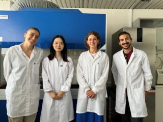 Im Rahmen des vom DAAD geförderten Projekts (Griechisch-Deutsche Kooperation, IKYDAAD) zur Entwicklung von antimikrobiellen Komposit-Hydrogelen auf Chitosan-Basis (Hydrogele mit bioaktiven Glas-Nanopartikeln) für die orale Wundheilung besuchten Frau Zhiyan Xu und Frau Hannah Kissel (Doktorandinnen) unsere Kollegen an der Aristoteles-Universität in Thessaloniki, Griechenland. In der Woche vom 17. bis 21. Juni zeigten ihnen Mitglieder der Forschungsgruppen von Prof. Eleana Kontonasaki (AUTh, Zahnmedizinische Fakultät) und Prof. Dimitrios Bikiaris (AUTh, Fakultät für Chemie) die verschiedenen Labore der Fachbereiche Zahnmedizin und Chemie, in denen sie dann gemeinsam projektbezogene Experimente durchführten, wie z. B. die Herstellung von Chitosan-Pflastern mittels Bioprinting. Auf den Fotos sehen Sie Zhiyan und Hannah mit Dr. Maria Bousnak (links) und Thanos Christodoulou (rechts) im Labor des Fachbereichs Zahnmedizin der Aristoteles-Universität Thessaloniki und mit Rizos Bikiaris (rechts, Doktorand) und Nikos Matchek im Labor des Fachbereichs Chemie der Aristoteles-Universität Thessaloniki.