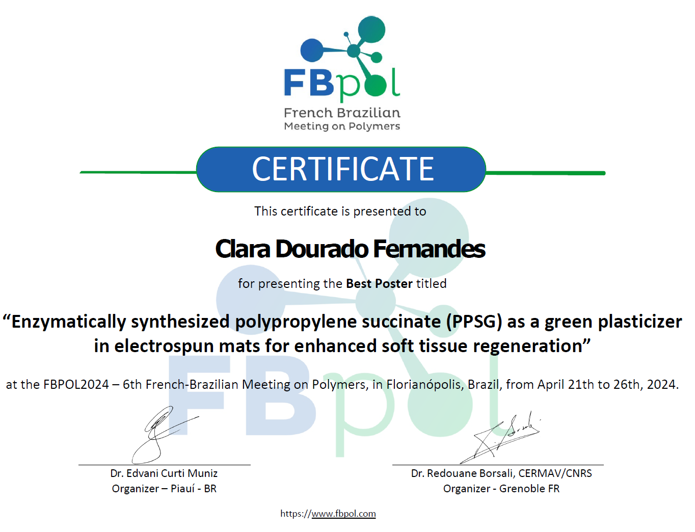 Die 6. französisch-brasilianische Tagung über Polymere (FBPOL) fand vom 21. bis 26. April in Florianópolis, Brasilien, statt. Die Veranstaltung, die für ihren Erfolg in früheren Ausgaben bekannt ist, diente weiterhin als erstklassige Plattform für die Erörterung der neuesten Fortschritte bei Polymersystemen. Zu den diesjährigen Teilnehmern gehörten unter anderem Expert*innen aus Brasilien, Frankreich, Japan, Taiwan, den USA, Hongkong, China und Portugal. Auf dieser Tagung wurde unsere Doktorandin Clara Dourado Fernandes, die Teil eines Cotutelle-Programms zwischen der Federal University of Santa Catarina (UFSC) in Brasilien und der FAU ist, für ihre herausragende Posterpräsentation ausgezeichnet. Ihre von Prof. Aldo R. Boccaccini am Lehrstuhl für Biomaterialien der FAU mitbetreute Forschungsarbeit mit dem Titel „Enzymatically synthesized polypropylene succinate (PPSG) as a green plasticizer in electrospun mats for enhanced soft tissue regeneration“ konzentriert sich auf die Entwicklung biokompatibler Materialien für die Geweberegeneration. Clara verwendet Poly(propylensuccinat-co-glycerolsuccinat) (PPSG) in Kombination mit Poly(ε-caprolacton) (PCL) zur Herstellung von Elektrospinnfasern für das Soft Tissue Engineering. Die in dieser Studie verwendeten elektrogesponnenen Matten und bioaktiven Glaspartikel wurden in unserem Lehrstuhl hergestellt.