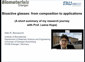 Prof. Aldo R. Boccaccini nahm (online) am Symposium teil, das an der Åbo Akademi University, Turku, Finnland, zur Feier der Karriere von Prof. Leena Hupa organisiert wurde. Prof. Boccaccini hielt den Vortrag: „Bioactive glasses: from composition to applications (A short summary of my research journey with Prof. Leena Hupa)“. Zu seiner beruflichen Beziehung mit Prof. Hupa sagte Prof. Boccaccini: „Es war mir eine Ehre, diesen Vortrag auf dem Symposium zu halten, um Leenas Karriere und Leistungen zu feiern. Wir arbeiten seit fast 20 Jahren mit Prof. Hupa und ihrem Team an der Åbo Akademi Universität in Turku zusammen. Zahlreiche bioaktive Glaszusammensetzungen wurden im Laufe der Jahre in enger Zusammenarbeit mit ihr entwickelt und charakterisiert, was zu zahlreichen gemeinsamen Veröffentlichungen, der Organisation von Symposien und Konferenzen geführt hat, und wir haben zusammen mit Prof. Delia Brauer einen der umfangreichsten Bände über bioaktive Gläser [1] herausgegeben. Leena hat uns mehrmals in Erlangen besucht und ich war selbst einige Male in Turku, insbesondere 2022, um die Ehrendoktorwürde der Åbo Akademi Universität zu erhalten. Wir wünschen Leena eine wunderbare Zeit nach ihrer Emeritierung, aber ich hoffe, dass wir weiterhin in Kontakt bleiben werden, da wir ihre Erkenntnisse über bioaktive Gläser und deren Eigenschaften immer brauchen!“