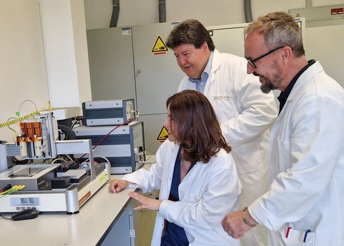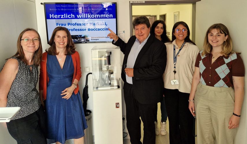 Prof. Markaki hielt den Vortrag zum Thema „Bioengineered Vascular Networks and Grafts“. Sie traf verschiedene Forscherinnen und Forscher am Lehrstuhl für Biomaterialien und diskutierte Themen für eine mögliche Zusammenarbeit, darunter neben Prof. Boccaccini auch Dr. Rainer Detsch und Prof. Iwona Cicha vom SEON des Universitätsklinikums Erlangen.