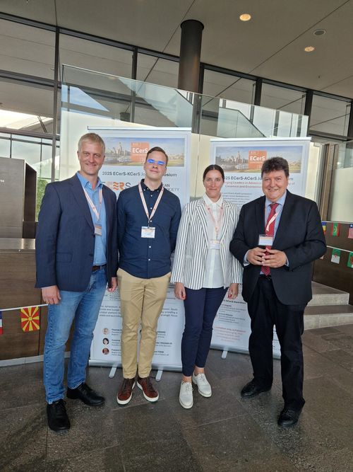 Unser Lehrstuhl war auf der XIX. Konferenz der Europäischen Keramikgesellschaft (ECERS 2025), die vom 31. August bis 4. September 2025 in Dresden stattfand, gut vertreten. Marcela Arango-Ospina und Zoya Hadzhieva präsentierten die Ergebnisse ihres Projekts mit dem Poster mit dem Titel: „Effect of protein-containing simulated body fluid on the in vitro bioactivity of 45S5 bioactive glass”. Prof. Boccaccini war einer der Hauptorganisatoren des Symposiums S10 „(Bio)ceramics, composites, and bioactive glasses for healthcare”. Er leitete zwei Sitzungen dieses Symposiums. Prof. Boccaccini hielt den Vortrag „Ion releasing bioactive glasses as building blocks for ionic medicine and tissue engineering applications”. Außerdem fanden Treffen der Arbeitsgruppe „BIoceramics” der European Ceramic Society statt, der Prof. Boccaccini und Frau Arango-Ospina angehören. Wir trafen uns auch mit unseren Partnern vom Centre for Functional and Surface Functionalized Glass (FunGlass) und dem Baltic Biomaterials Center of Excellence (BBCE) in Riga, Lettland.