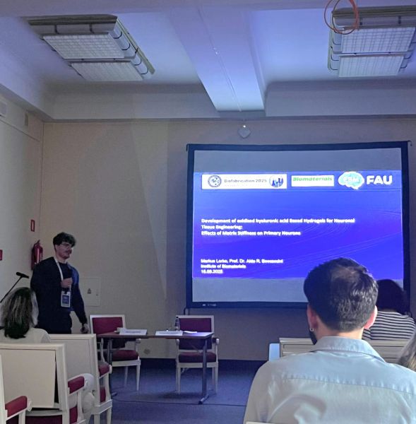 Unser Lehrstuhl war auf der International Conference on Biofabrication (ISBF 2025), die vom 13. bis 17. September 2025 in Warschau, Polen, stattfand, gut vertreten. Hsuan-Heng Lu und Markus Lorke (Promovierende) stellten die Ergebnisse ihrer Projekte in mündlichen Vorträgen mit den Titeln „Alginate-dialdehyde–gelatin (ADA-GEL) based composite hydrogels for skeletal muscle biofabrication: development with an ionic medicine strategy” und „Development of oxidized hyaluronic acid-based hydrogels for neuronal tissue engineering: effects of matrix stiffness on primary neurons”. Darüber hinaus war der Sonderforschungsbereich (SFB) 225 TRR, der ebenfalls Sponsor der Konferenz war, stark vertreten. Es war auch eine großartige Gelegenheit, ehemalige Mitglieder und Gastforschende des Lehrstuhls zu treffen. Prof. A. R. Boccaccini war Mitglied des wissenschaftlichen Beirats der ISBF 2025.