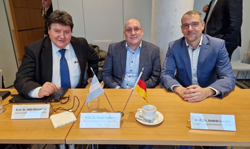 Am 10. November nahm Prof. Aldo R. Boccaccini am „Argentinisch-Deutschen Wissenschaftstag” in der argentinischen Botschaft in Berlin teil. Diese Veranstaltung wurde im Rahmen der Berlin Science Week organisiert, und Prof. Boccaccini nahm in seiner Eigenschaft als wissenschaftlicher Koordinator (Emeritus) des Netzwerks argentinischer Wissenschaftler*innen in Deutschland (RCAA) daran teil. Die Veranstaltung zeigte die bemerkenswerten Möglichkeiten für Forschungskooperationen und wissenschaftlichen Austausch zwischen deutschen und argentinischen Institutionen auf. Zusammen mit den RCAA-Koordinatoren Prof. Andres Fabian Lasagni (TU Dresden) und Dr. Flavio Soldera (Universität des Saarlandes) traf Prof. Boccaccini Frau Betina Pasquali de Fonseca, die argentinische Botschafterin in Deutschland, und Lic. Darío Genua, den argentinischen Staatssekretär für Innovation, Wissenschaft und Technologie.