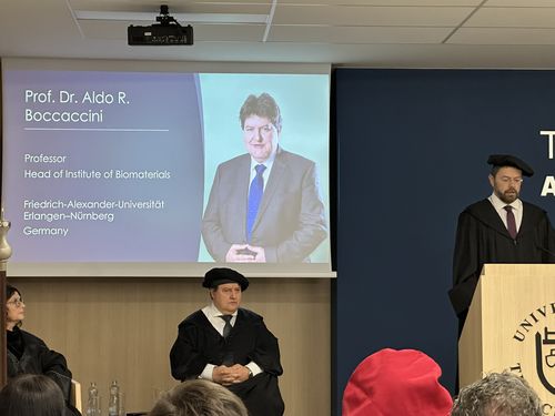 Am 12. November 2025 wurde Professor Aldo R. Boccaccini von der Alexander-Dubček-Universität Trenčín (TNUAD) in der Slowakei die Ehrendoktorwürde verliehen. Die Verleihungszeremonie fand in Trenčín in Anwesenheit des Rektors der Universität, Prof. Jozef Habánik, Mitgliedern des Wissenschaftlichen Rates der TNUAD, Fakultätsmitgliedern, Studierenden und Mitgliedern der akademischen Gemeinschaft der Universität statt. In seiner Laudatio hob Prof. Dušan Galusek, Direktor des Zentrums für funktionelles und oberflächenfunktionalisiertes Glas (FunGlass) an der TNUAD, hob in seiner Laudatio die herausragende Karriere von Prof. Boccaccini hervor, die wissenschaftliche Exzellenz, eine internationale Vision für effektive wissenschaftliche Zusammenarbeit und eine hervorragende Betreuung der nächsten Generation von Forschenden vereint.