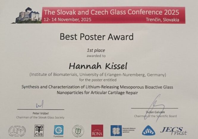 Wir freuen uns, Ihnen mitteilen zu können, dass Frau Hannah Kissel, Doktorandin am Lehrstuhl für Biomaterialien unter der Leitung von Professor Aldo R. Boccaccini, den ersten Platz beim Wettbewerb um das beste Poster auf der Slowakisch-Tschechischen Glaskonferenz 2025 gewonnen hat, die vom 12. bis 14. November in Trenčín, Slowakei, stattfand. Hannah präsentierte die Ergebnisse ihrer Doktorarbeit im Bereich der Ionenmedizin, wobei sie sich auf die Stimulierung der Knorpelreparatur durch die Zufuhr biologisch aktiver Mineralionen unter Verwendung von Lithium freisetzenden mesoporösen bioaktiven Glasnanopartikeln konzentrierte. Herzlichen Glückwunsch, Hannah!