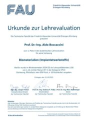 Wir freuen uns, die Auszeichnung bekannt zu geben, die Prof. Aldo R. Boccaccini von der Fakultät für Ingenieurwissenschaften der FAU erhalten hat. Er belegte den ersten Platz in der gesamten Fakultät für Ingenieurwissenschaften in der Lehrbewertung durch Masterstudierende des Kurses „Biomaterialien (Implantatmaterialien)”. Prof. Boccaccini sagte: „Es ist großartig, diese Auszeichnung zu erhalten, die die positiven Erfahrungen unserer Studierenden in unseren Masterstudiengängen hervorhebt. Ich danke allen Studierenden herzlich für ihr Engagement in den Vorlesungen und ihre Begeisterung für Biomaterialien.”