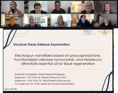 Herzlichen Glückwunsch an Karla Faquine Rodrigues zur erfolgreichen Verteidigung ihrer Doktorarbeit mit dem Titel „Elektrogesponnene Nanofasern auf Basis von Polycaprolacton, funktionalisierten Cellulose-Nanokristallen und ätherischem Öl aus Melaleuca alternifolia für die Geweberegeneration” am 15. Januar 2026. Karla führte ihre Doktorarbeit am Instituto Tecnológico de Aeronáutica – ITA in Brasilien unter der Betreuung von Prof. Gilmar Thim und Prof. Thaís Montanheiro in Zusammenarbeit mit Prof. Aldo R. Boccaccini an der FAU durch. Prof. Boccaccini hob den innovativen Charakter von Karlas Projekt auf dem Gebiet der funktionellen Faserstrukturen für die Weichteilreparatur hervor, insbesondere die Verwendung von antibakteriellen ätherischen Ölen. Aus den Ergebnissen von Karlas Projekt sind mehrere Artikel in Vorbereitung, und ein umfassender Übersichtsartikel wurde bereits veröffentlicht [1]. Wir gratulieren Karla herzlich zur erfolgreichen Verteidigung ihrer Doktorarbeit und wünschen ihr alles Gute für ihre weitere Karriere.