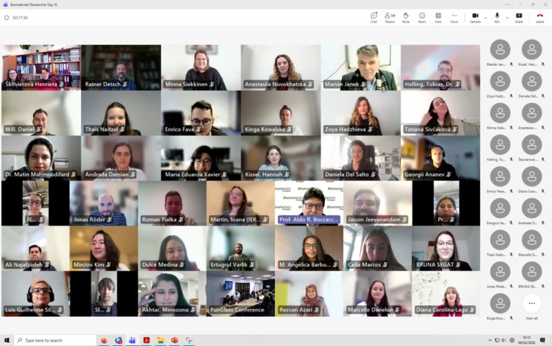 Der 3. Tag der Biomaterialforschung der Abteilung für Biomaterialien am FunGlass Center wurde gemeinsam von Dr. Martin Michálek (Leiter der Abteilung für Biomaterialien, FunGlass Center, Trencin, Slowakei) und Prof. Aldo R. Boccaccini organisiert und fand am 9. Februar 2026 in hybrider Form statt. Dieses wissenschaftliche Symposium umfasste 10 Vorträge von Forschern des FunGlass Centers und des Lehrstuhls für Biomaterialien der FAU. Mehrere Vorträge waren das Ergebnis der langjährigen Zusammenarbeit zwischen beiden Forschungseinrichtungen. Prof. Boccaccini sagte: „Es ist großartig, dass wir den Forschungstag zum dritten Mal in Folge organisiert haben. Es gab sehr interessante Vorträge, hauptsächlich von Nachwuchswissenschaftlern, die die breiten Forschungsgebiete im Bereich Biomaterialien beider Institutionen vorstellten. Wir hatten auch Gastredner eingeladen. Mehrere Vorträge zeigten neue Forschungsrichtungen auf, die wir verfolgen werden, um die Zusammenarbeit und die Möglichkeiten an beiden Einrichtungen auszubauen.“ Die Veranstaltung zog mehr als 70 Online-Teilnehmer an, was das starke internationale Interesse an der Biomaterialforschung unterstreicht. Herzlichen Glückwunsch an die Mitglieder unseres Lehrstuhls, die hervorragende Vorträge gehalten haben: die Doktoranden Hannah Kissel, Andrada-Ioana Damian-Buda, Jonas Röder und Memoona Akhtar.